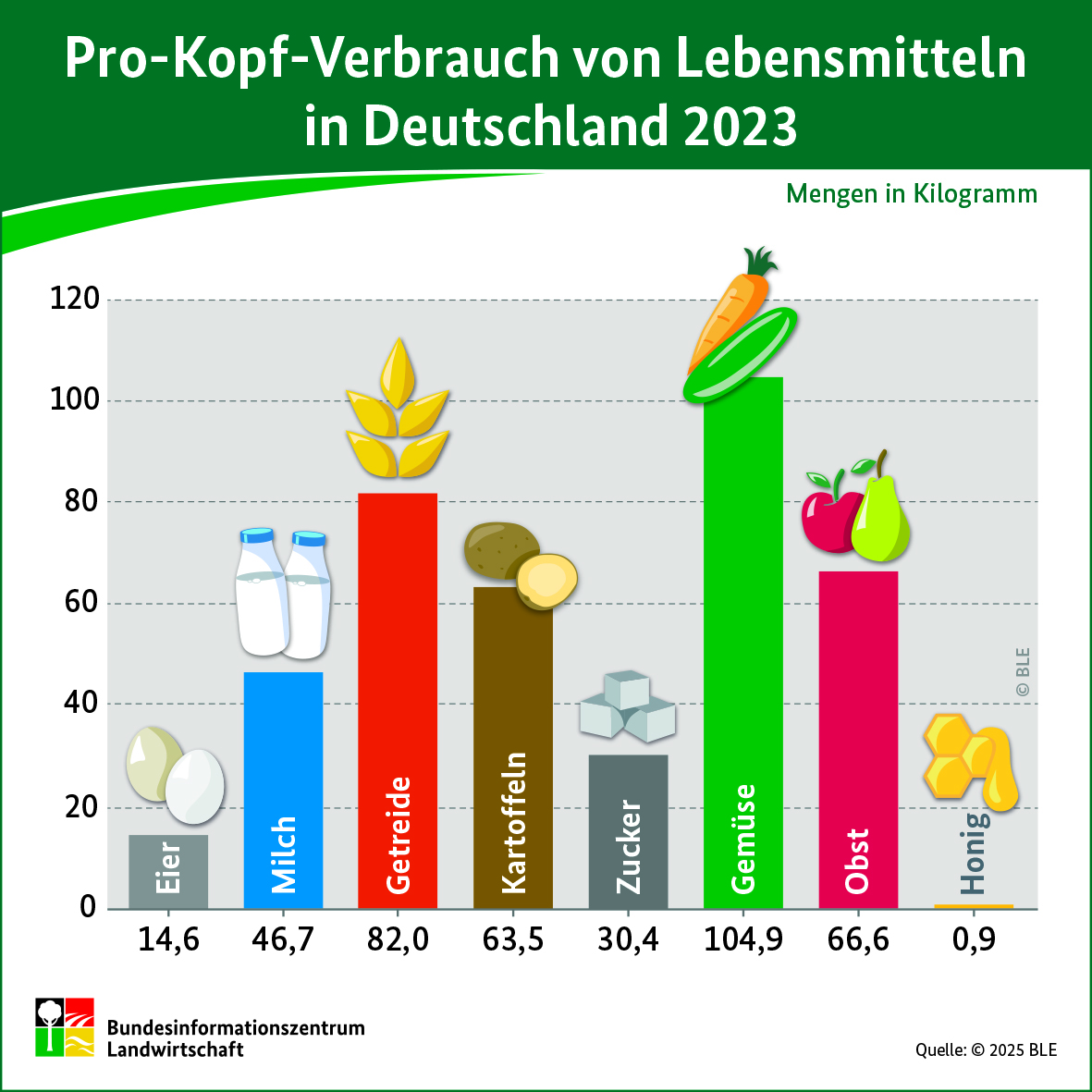 Pro-Kopf-Verbrauch von Lebensmitteln in Kilogramm Bildgalerie Drucken Teilen Das Bundesinformationszentrum Landwirtschaft stellt Grafiken zum Pro-Kopf-Verbrauch von Lebensmitteln zur Verfügung. Pro-Kopf-Verbrauch von Lebensmitteln 2023/ Bundesinformationszentrum Landwirtschaft Schlachtgewicht von Schwein, Geflügel und Rind pro Kopf 2023/ Bundesinformationszentrum Landwirtschaft (BZL) Bild Lizenzen Drucken Teilen