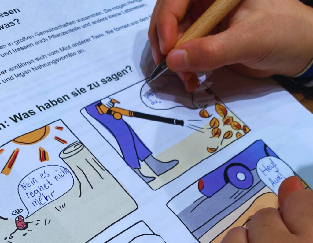 - Kreativer Perspektivwechsel: Die Kinder arbeiteten an einem Comic und versetzten sich direkt in die Lage der Bodenlebewesen. Sie ergänzten Texte zu verschiedenen Szenen – zum Beispiel aus der Sicht eines Springschwanz, der plötzlich von einem Laubpuster erfasst wird.